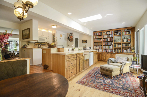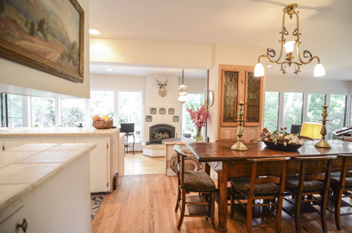 This sunny, romantic home features a greenhouse as an entrance, a library, a large living room with a grand piano at one end and a massive fireplace at the other. There are ceiling to floor windows and hardwood flooring throughout with some wall-to-wall Berber carpeting. There is an open, formal dining room with a 17th-century trestle table and prie-dieux chairs with heavy velvet cushions.