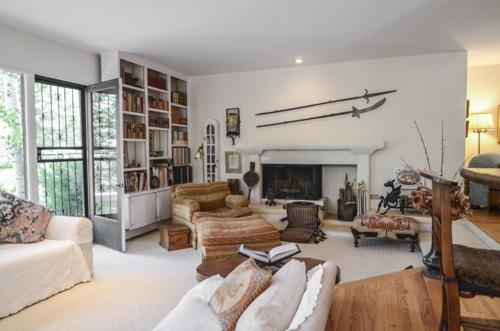 The 875 sq. foot master bedroom, like the rest of the house, is on different levels: the upper area has a king bed, hardwood floors, an opening skylight for star-gazing at night, a large window seat with cushions, more bookcases and a glass door to a small balcony. An 1890’s armoire from an historic Aspen home – The Floradora – contains the television.