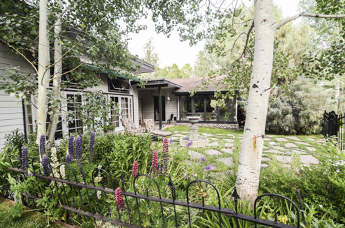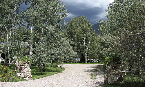 A natural setting, in contrast to a lot of lawn and flower gardens, is the fishing island on the Roaring Fork River with lawn chairs, a beach accessed by steps. This is a great place for a family barbeque or reverie with a book.