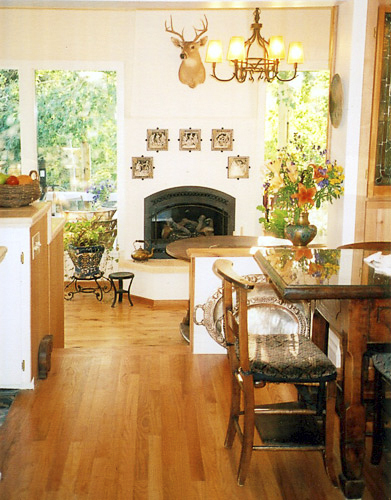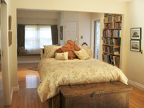 The smallest bedroom suite, African in decor and built on two levels, has hardwood floors, a built-in queen bed with a trundle – like an old Dutch kaas or a ship’s bed with curtains. There is a skylight, and a small carpeted office or living room area with a private French door entrance, an antique roll top desk, a pot belly stove and lounge chair. The bathroom, with tub and shower, is just across a hall.