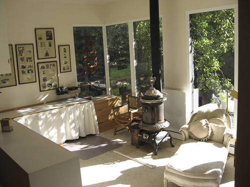 The private bathroom – with steam shower – has a small vanity area that looks out onto the River. The lower area has ceiling to floor windows and white Berber carpeting. There is a two person, round hot tub with colorful tiling from Mexico and a glass door leading to a private outside deck over-looking the River. Relax in the bath to a crackling fire in the elaborate antique potbelly stove. There is also an office area with views of the River and gardens at the far end of the room, yet out of sight of the main bedroom.
