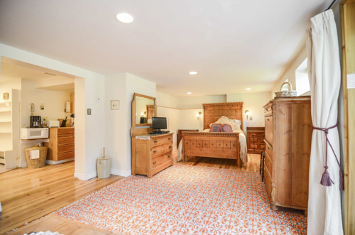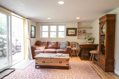 The Patio Apartment has two main rooms that are entered through a large sliding glass door.