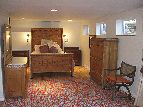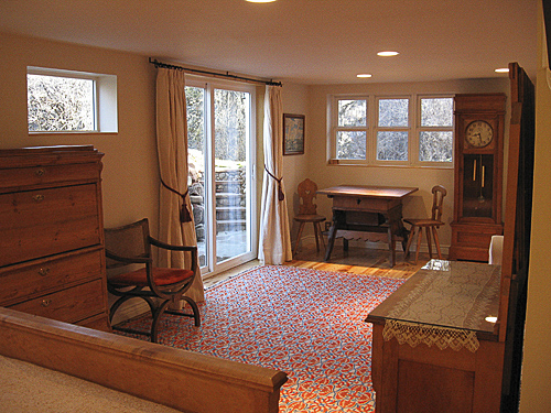 The heated floors are Pine and the furniture is 19th century. Hand-woven throw rugs from Mijas, Spain, some lovely paintings and pictures make this light-filled apartment a visual joy. There is an antique, high-backed queen bed from Aspen’s historic Floradora Lodge, a secretary dresser from the historic Sardy House, a leather couch, a grandfather’s clock, and an inlaid eating table from rural Hungary.